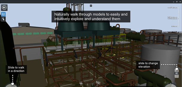 直观地浏览三维模型并与之互动。进行虚拟漫游,身临其境地探索和调查模型及嵌入其中的属性数据。