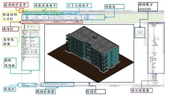 如图所示,在Revit2018中工作界面分成了若干区域,各区域相互协作,构件了完整的工作界面。