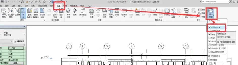若要打开“项目浏览器”,请单击“视图”选项卡“窗口”面板,“用户界面”下拉列表,“项目浏览器”,或在应用程序窗口中的任意位置单击鼠标右键,然后单击“浏览器”“项目浏览器”。