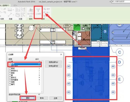 当选择中包含不同类别的图元时,可以使用过滤器从选择中删除不需要的类别。例如,如果选择的图元中包含墙、门、窗和家具,可以使用过滤器将家具从选择中排除。